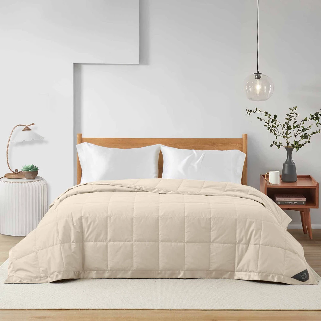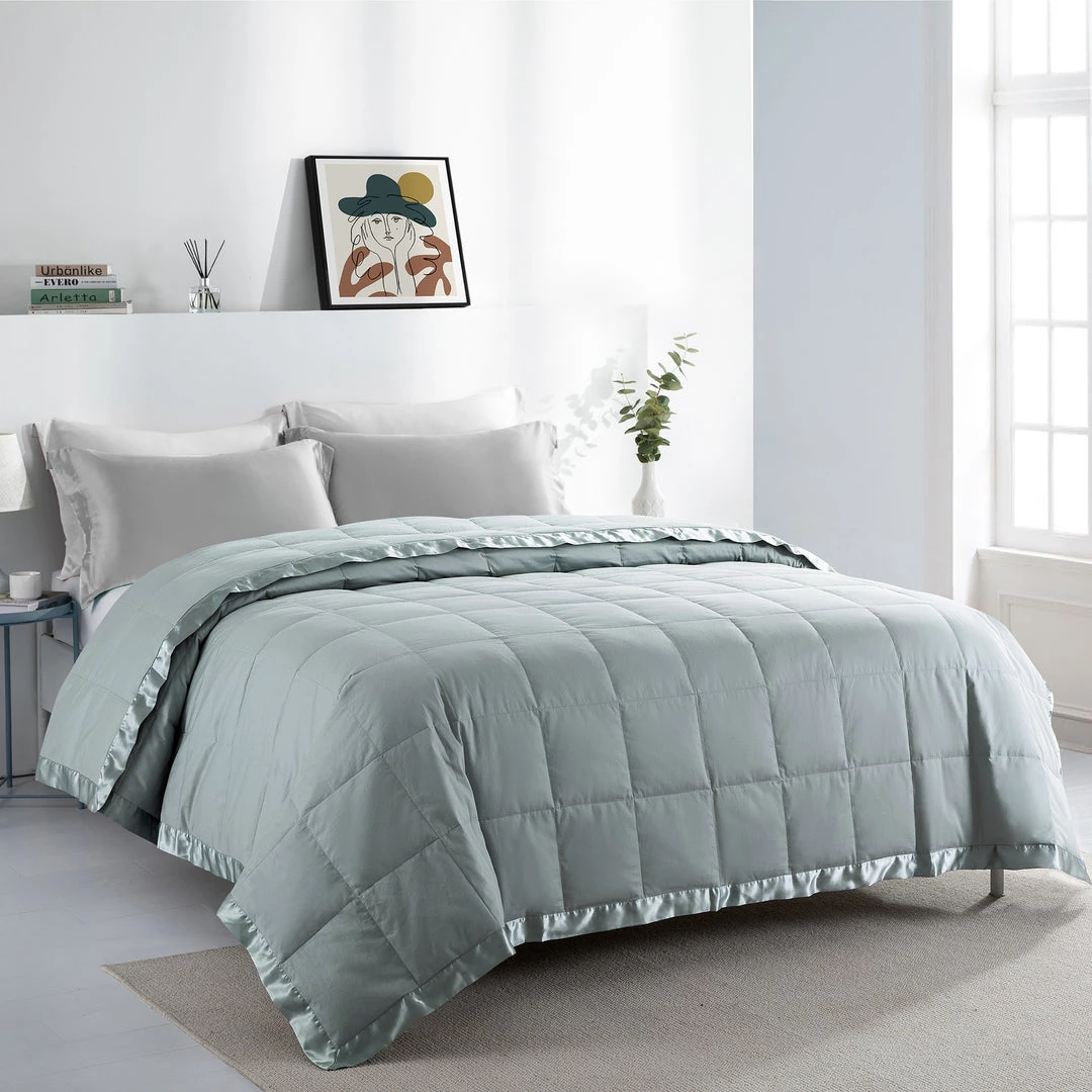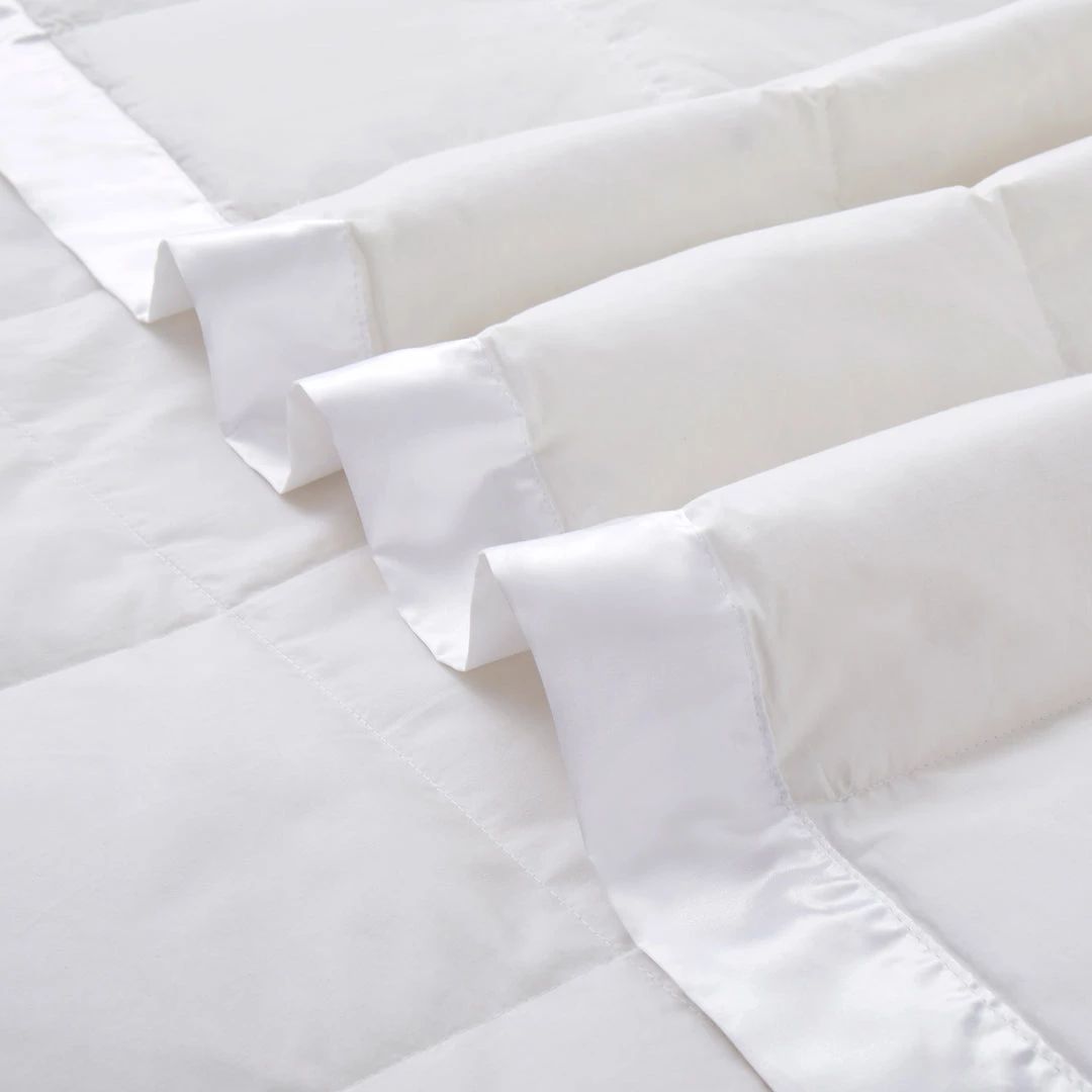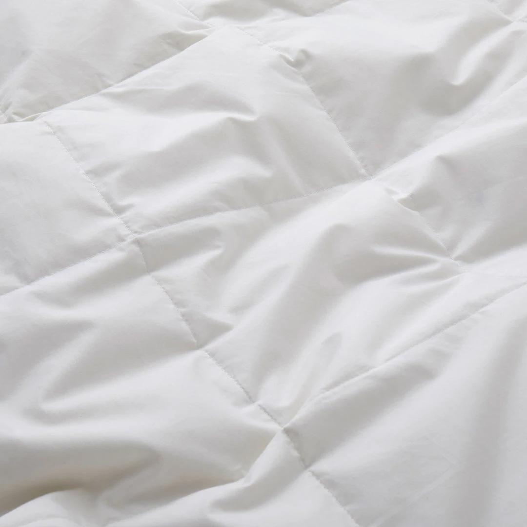 The lightweight down blanketΒ boasts a 100% cotton cover with satin weave blanket binding and 300 thread count for minimal leaking of down.Β