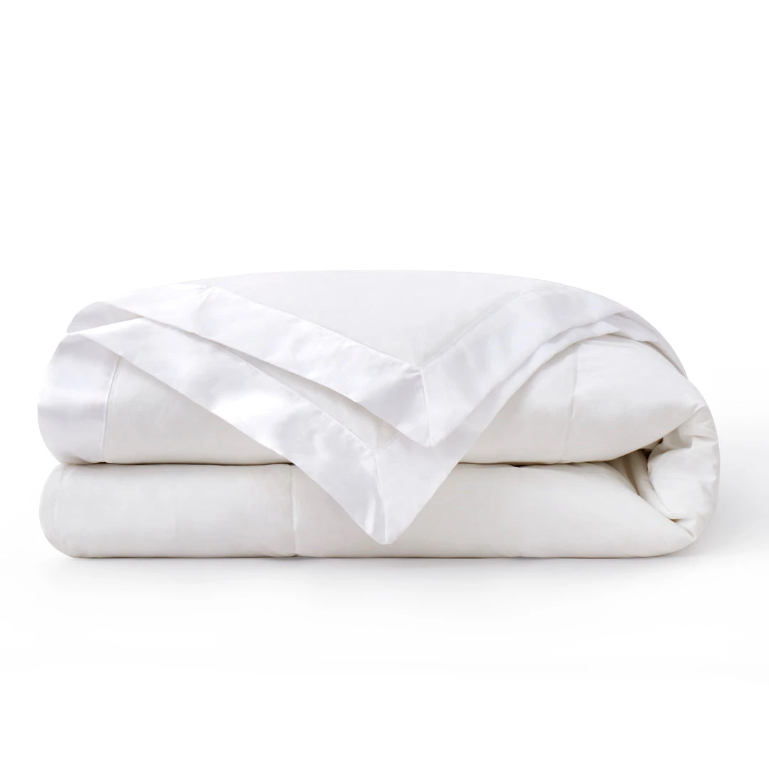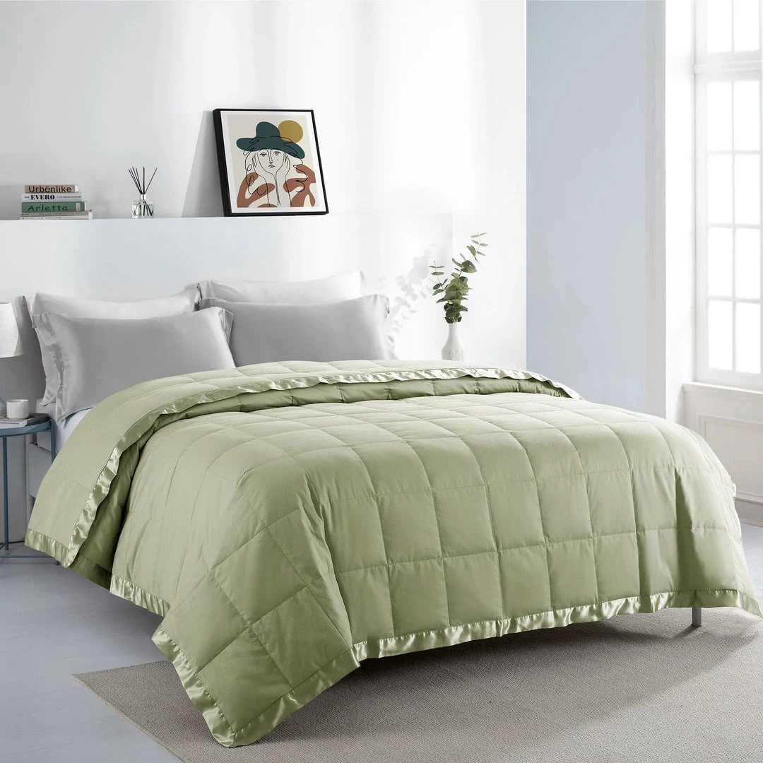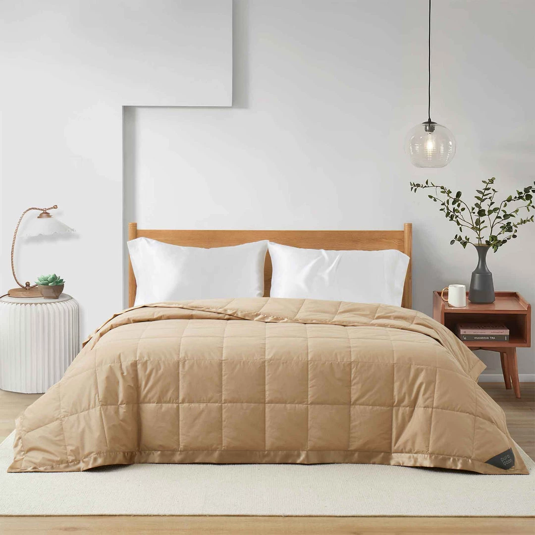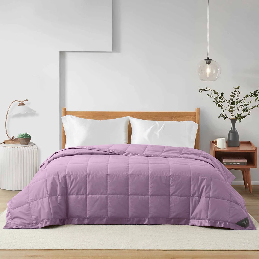 The lightweight down blanketΒ boasts a 100% cotton cover with satin weave blanket binding and 300 thread count for minimal leaking of down.Β
