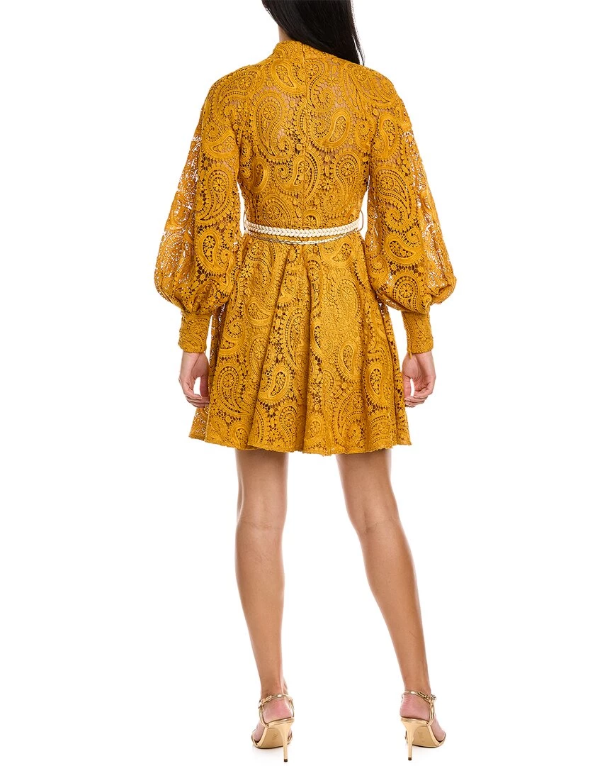 - Anneke Lace Mini Dress In Mustard With High Neck, Blouson Sleeves, Lace Design, Belted Waist, And Decorative Button Detailing
