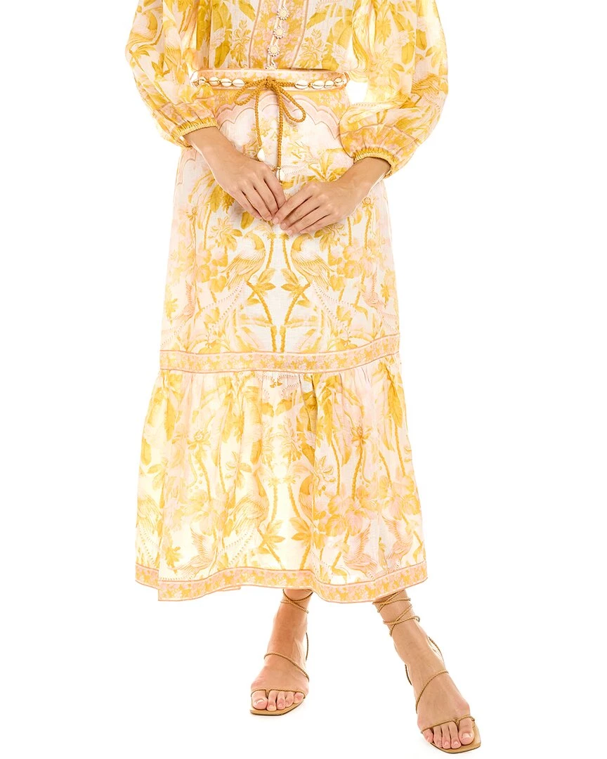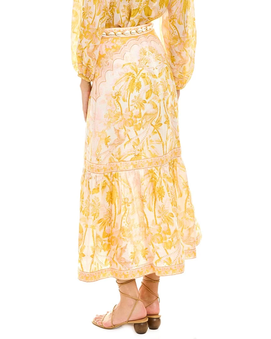 - Lyre Frill Hem Linen Midi Skirt In Yellow Palm With Ruffle Hem And Shell Belt At Waist