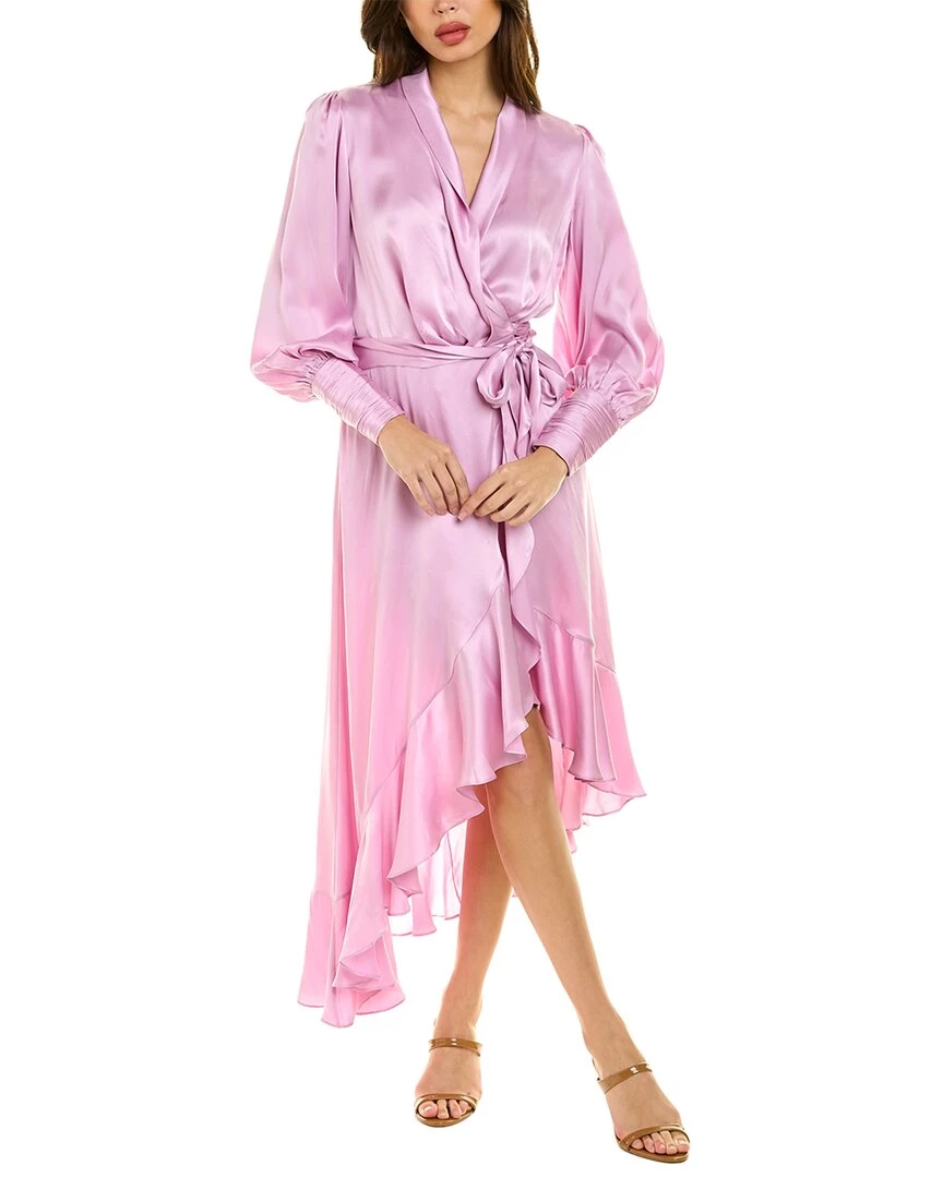 - Silk Wrap Dress In Mauve With Satin Design, Pleated Bodice, Ruched Zippered Cuffs, And Ruffle Hem