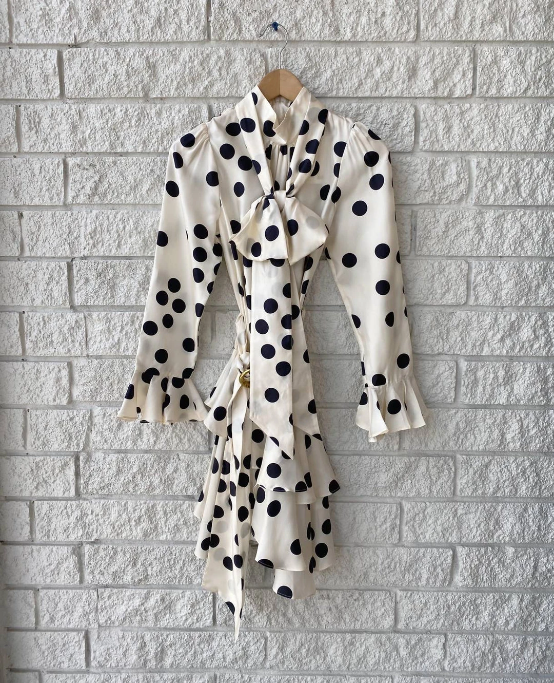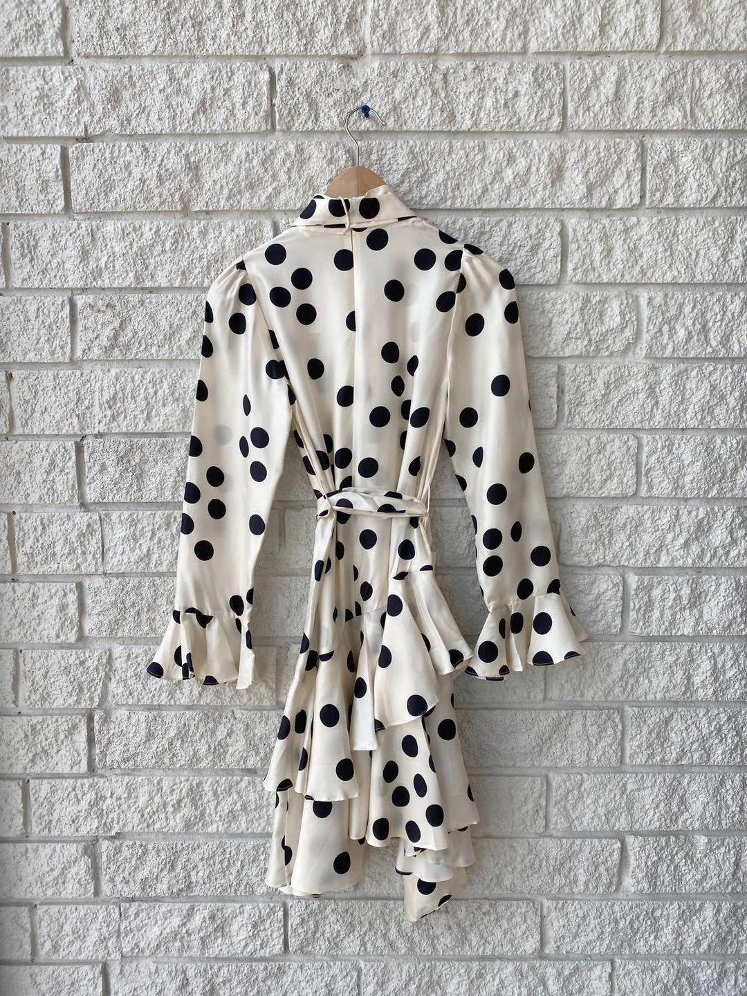 High neckline with a side neck tie that drapes around the top if the shoulder. It has a tiered asymmetrical bottom portion with a tie belt at the waist. The sleeves are pleated at the wrist.Dry Clean Only