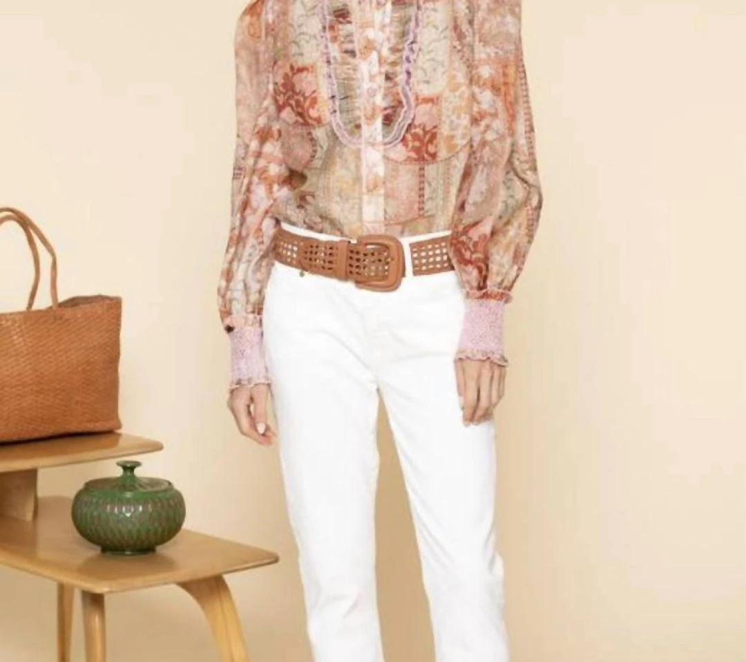 The Kaleidoscope Tuxedo Blouse in Red Swirl Floral from Zimmermann Fall 2022 Collection, Stargazer. A silk linen organza blouse featuring a smocked cuff, gathered ruffles and snap buttons down the centre front. Dry Clean Only. Sized 0,1,2,3,4