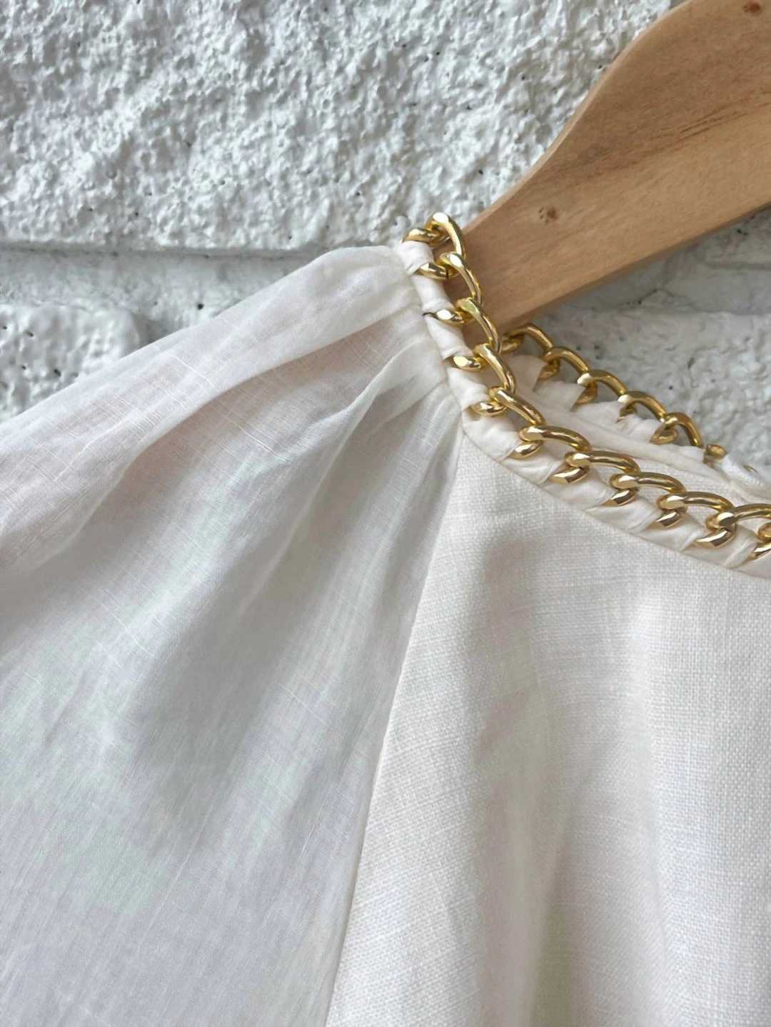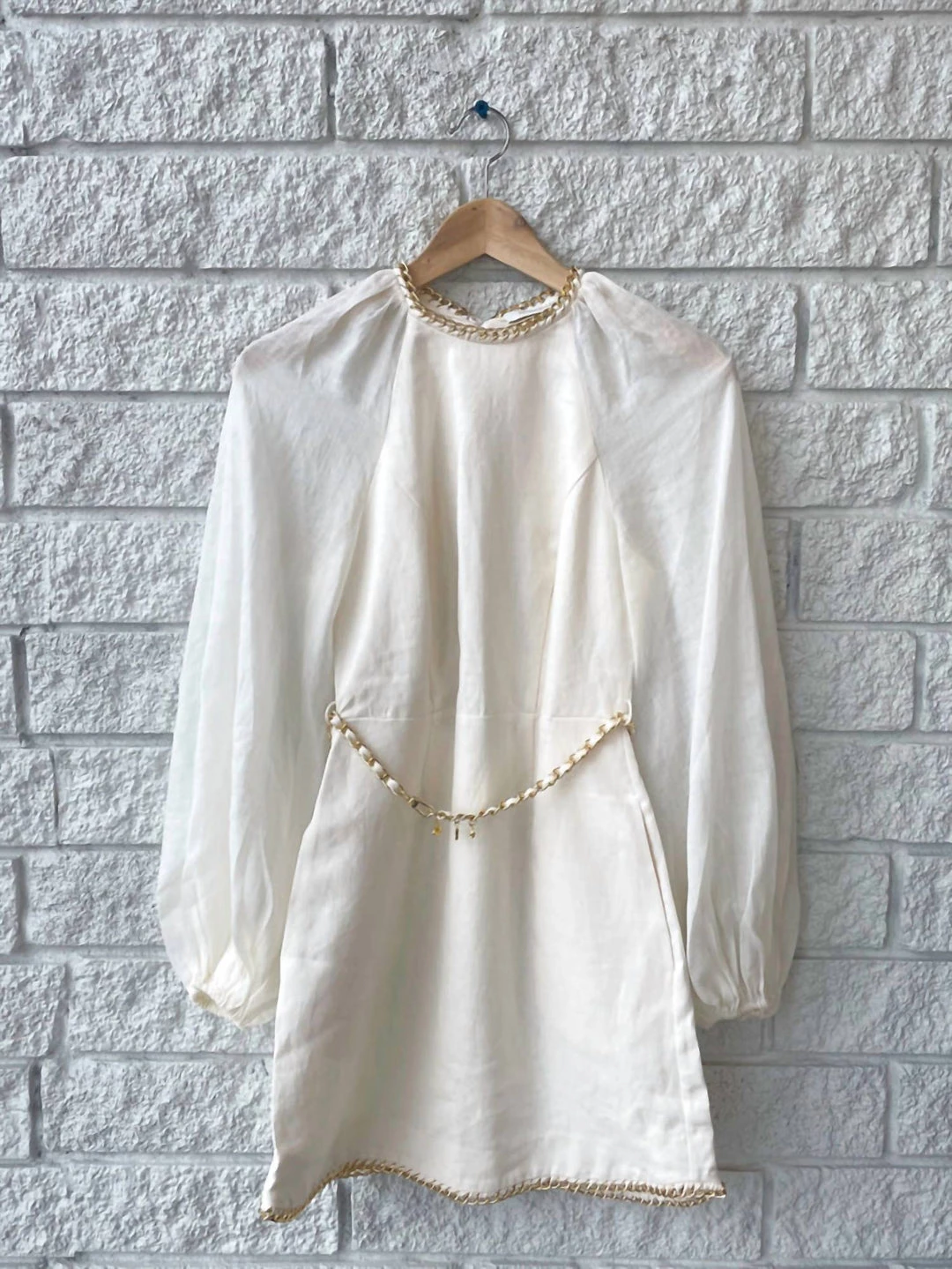 High neck with gold chain detailing around the hem. It is a tailored fit and has balloon sleeves with a sheer outer layer. It has a gold chain belt at the waist. The bottom hem has a gold chain detailing.����